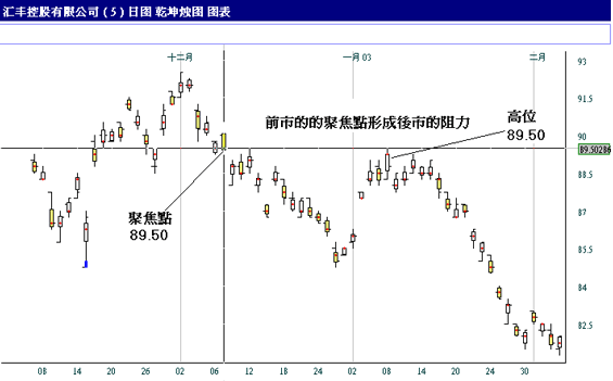 經長時間的驗証,乾坤燭發現主要的支持及阻力位往往與以往的聚焦點吻合。聚焦點為該日成交量最多的價位,亦即該日的平衡點,而該平衡點將會構成日後支持及阻力的依據,但天天也有聚焦點,那一點才是最重要呢? 乾坤燭理論是一門藝術,而不是一門科學。首先我們從市頂及市底著眼,看看乾坤燭如何比傳統技術分析工具優勝。