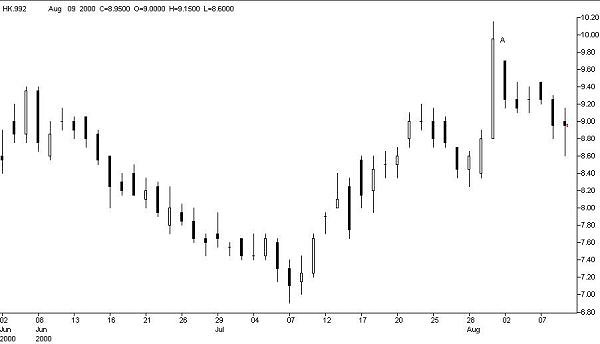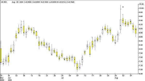 下圖是聯想(992)的陰陽燭圖,燭A是一支大陽燭,衝破近期阻力位,但股價在第二天開始下跌,明顯地是個技術陷阱。