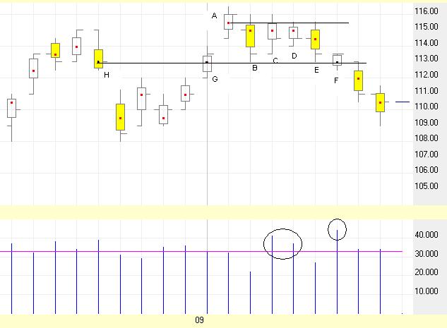 附圖為匯豐( 005)乾坤燭圖,下方是聚焦量,在A處,股價見過116元的高位後進入調整,大約一個星期內已跌到109元。留意圓圈位置4支燭B至E,它們全部受制於A的聚焦點阻力,表示在A的聚焦點價位,沽售壓力相當大。