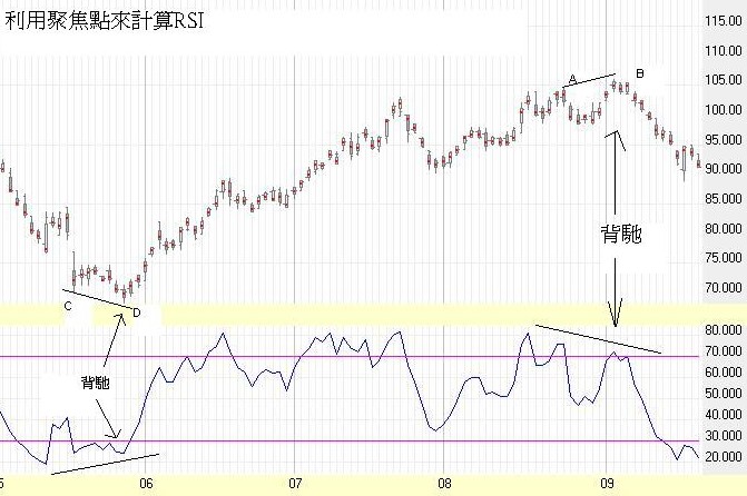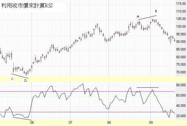 下圖是長實 (001)的乾坤燭及傳統RSI圖,在B和D處,RSI並未出現背馳,原因很簡易,收市價只是一個價位,而聚焦點來源於整天的交易,更值得信任。