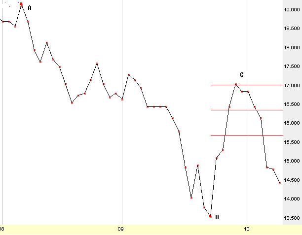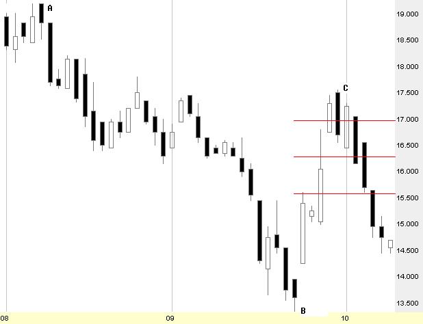 上圖是德昌電機 (179)的陰陽燭圖,從A跌到B後,股價反彈到C,收市位已經高過0.618水平,如果你以為新升浪已展開,你將墮入走勢陷阱,因股價隨即迅速回落。
