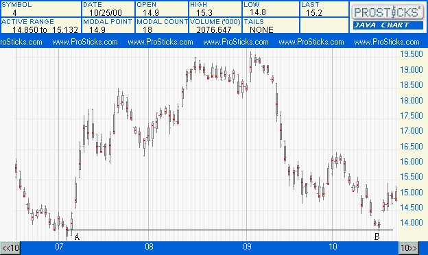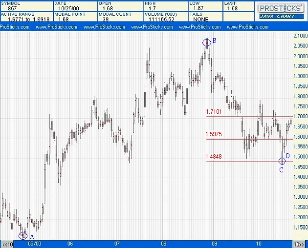 下圖是九倉 (004)的乾坤燭圖,股價跌到B處,隨即反彈,留意B的低點同A的聚焦點一致,表示在A的聚焦點,股價找到支持,但這並不表示股價不會再跌破此位。在B處買入者,即使獲得可觀的帳面利潤,仍然不可掉以輕心。