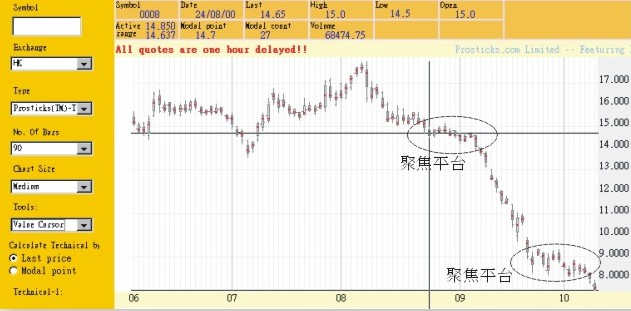 就以上星期電訊盈科 (0008)為例,由8月24日至9月6日形成聚焦點平台,9月6日跌穿平台之後,一直江河日下,不可收拾。由9月22日又形成另一聚焦點平台,10月11日又再跌穿聚焦點平台,應該說,是另一次跌勢的開始。