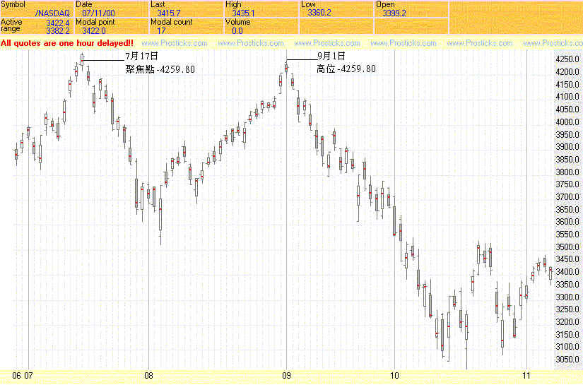 假設你是因為看到了8月3日的走勢逆轉而入了市,如你所願,市況節節上升,技術指標亦由超賣變成超買,你要找一個合理的出市價位,如從傳統技術分析著眼,最合邏輯的便是7月17日的高位4289.10點(當天的聚焦點是4259.980),若因市況波動太大,你或會將出市價放在4280點或4270點,但你會錯失了9月1日出市機會,因9月1日最高只是4259.80點。記住,若你能估中4259.80點真比中六合彩還難,但乾坤燭圖表明確告訴你,4259.80點是7月17日的聚焦點,是上一個浪頂的買賣平衡點,故此若你決定出市,你設定的出市價,肯定是4259.80點之下,而不是4289點之下。這樣,你便不會錯失出市良機。後市的發展,已是每況愈下。如你未能掌握在4259.80點之下出市,你的處境自然是天壤之別了。