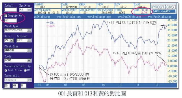 隨後如附圖,網頁出現了藍、紅二種顏色的對比線。這是一個150天的對比圖,與坐標0位、水平相對的左邊起點,是表示以150天前(18/5/2000)的股價為「0」作對比的基數。而數據列的EMA:藍色的39.83,表示長實比150天前的價位上升了39.83%;粉紅色的2.79,表示和黃比150天前的價位只上升了2.79%。