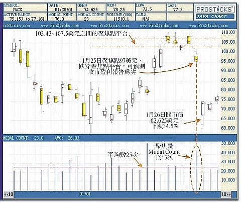 細看PMCS的圖表(下左):1月25日之前,在103.43至107.5美元之間形成一個聚焦點平台,而市場預告當天收市後將公布該公司的盈利情況。盈利報告的「好、劣」,必將影響價位而變得舉足輕重,故備受市場關注。持有此股票的投資者如果借助乾坤燭圖表,就可以在收市前半個小時清晰地看到當天的資訊:開市價101.31美元已跌穿之前的聚焦點平台;並且一路向下跌,聚焦點97美元,而聚焦量為43次,高出平均數25次很多,說明該價位好淡爭持劇烈;及後知道內情的淡友佔上風,推倒97美元的防線,以95.875美元低位收市。