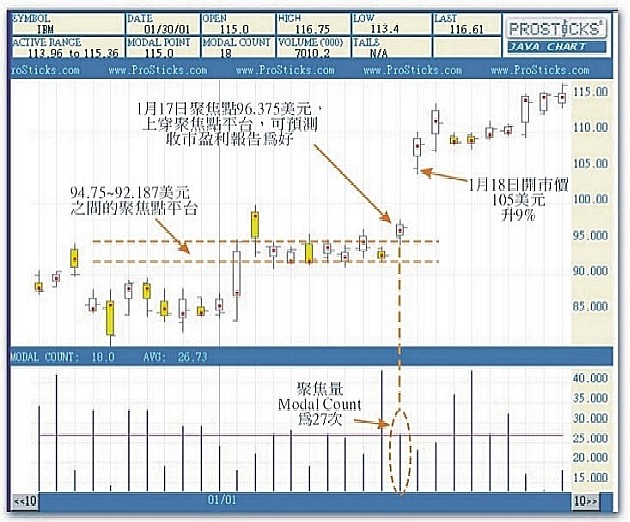 從IBM的圖(下右)也可看到:在1月17日前有一個94.75至92.187美元的聚焦點平台,當天收市後也會宣布盈利狀況,是好、是劣?市場一樣翹首以待。在收市前半小時,投資者也可借助乾坤燭的「明鏡」,透視當天玄機:開市價95.375美元,升破聚焦點平台,聚焦量僅27次,接近平均數27次,說明價位上升很順暢,知道內情的「好友」佔上風,股價慢慢被「收高」,以高於聚焦點的96.687美元收市。果然收市後公布的是一個盈利較預期增長的「好」報告。第2日以105美元開市,裂口上升。