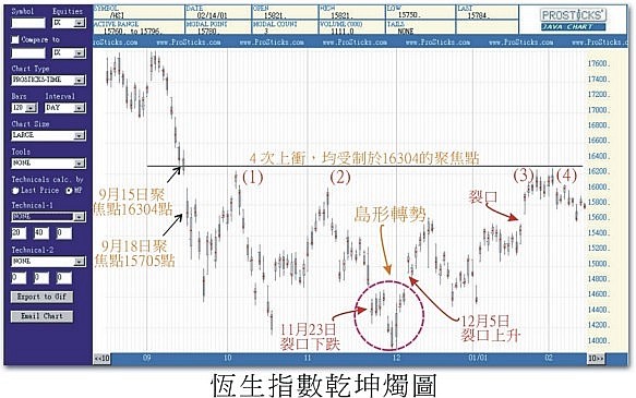 自去年9月15日以來,恆指有4次向上衝,但一直受制於16,304的聚焦點,成交量偏低,上升乏力,無功而回。最近雖然盤整位置高移,可視為蟄伏待機,向上突破,但也要嚴防「島形轉勢」。有此兩手準備,方能立於不敗之地。