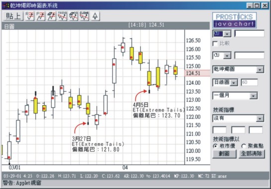─ 偏離尾巴,意指美元兌日圓下跌 點到121.8的時候,即遇到強力的承接盤,收市在該位之上,而且第2日價位又上升了,此時買貨或第2天買貨,應不會跌穿此價位,值得一博。4月5日的乾坤燭在123.7價位也有偏離尾巴的黑點,也表示在此價位有較強的承接力,如在此位入貨或在第2天入貨也不會跌破此價位,而且有50至100點的進賬。