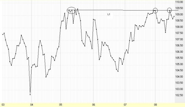 從美元兌日圓的聚焦點線圖看,頂部共有六個聚焦點落在109.45這個價位,形成聚焦點平台L1(圖一)。這聚焦點平台是一個很強的阻力,每次美元升至此位,沽壓即湧現推低價位,因此可以預期109.45在將來亦發揮阻力作用。然而,美元一旦升破此位,上升趨勢將會出現。需要留意的是,筆者所講的升破阻力位,並非指當日的某一價位,而要聚焦點也在此阻力位之上才算。