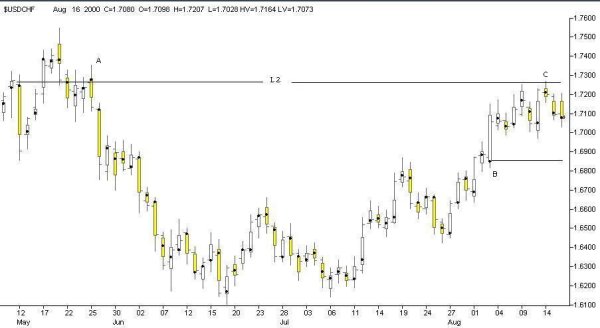 從美元兌瑞士法郎的乾坤燭圖看,自在6月份跌至1.62後開始反彈,但卻受阻於聚焦點平台L2(圖二)。L2是連接兩個價位在1.7265的聚焦點而成,其中之一是A燭的聚焦點。A燭的聚焦點有何特別?A是價位從1.75至1.62跌浪的起步點,代表強者在此開始沽出,尤其是在聚焦點價位。其後,價位再次上升,但到達L2即受阻,這個事實進一步確認L2的阻力作用。