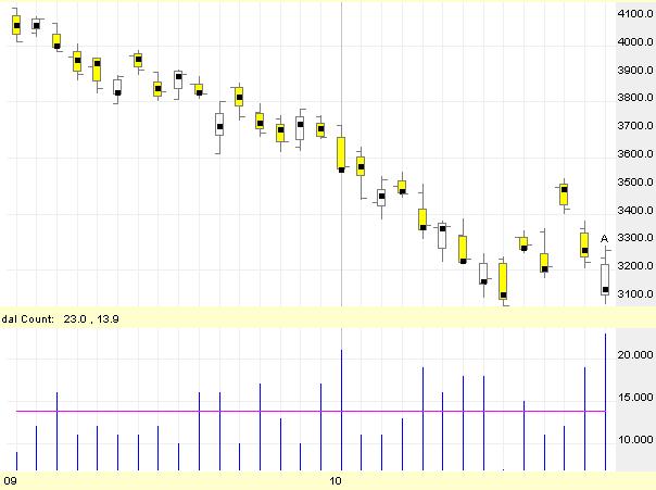 留意A處,當天開市後納指曾急跌 148點或4.5%,其後買盤戲劇性地在午市湧入市場,結果當天納指收市升42點。它的聚焦點處於燭的低位,聚焦量特別高,說明買方在獲得勝利前,曾經與沽方進行過激烈戰鬥。