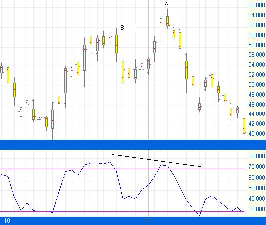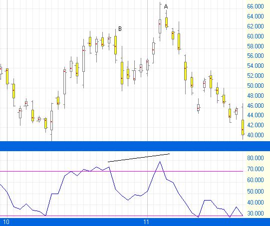 從 PALM的乾坤燭圖看(圖一),下方的RSI由聚焦點計算出來。A處的價位雖然高過B處而創新高,但A處的RSI卻不能高出B處,此謂背馳,是一個見頂訊號,股價隨即急速下挫。