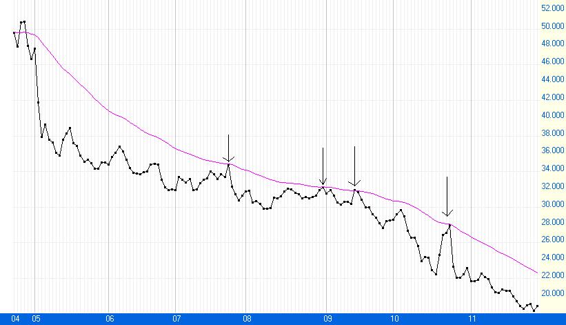 AT&T是美國最大的電話公司,正如香港的電訊盈科(008)。比較起62美元的歷史高位,目前股價已經下跌70%(圖)。不過,圖中的四十天平均線,不是普通的移動平均線,它是用聚焦點代替收市價計算出來的(在乾坤燭網頁,允許使用者自由選擇用收市價還是用聚焦點來計算移動平均線)。