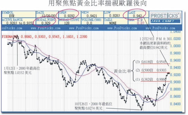 黃金比率是波浪理論的數學基礎,用來預測後市,準確性相當高,廣為市場人士所採用;而聚焦點是每天成交時間最長的焦點價位,以兩者結合來測市,點、線吻合的機會甚多,功效更加顯著。圖中三條線,是歐羅這一次回升的三個目標價位,也可以說是回升中的三級阻力位:( 1 ) 12月20日以0.9096美元衝破了第一級的0.9060阻力位而上升,歷經第一目標價位;( 2 ) 從12月27日至29日連續數天,市場人士在0.9303美元價位拉鋸盤整,點、線吻合,說明到達第二目標價位時,已有套利沽盤,阻力顯著加大。