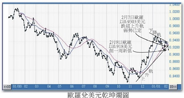 從歐羅兌美元的乾坤燭圖中可見,由11月24日的0.839美元和1月29日的0.9188美元可連成一條上升軌。2月7日歐羅跌破四十天平均線,並以0.9303美元跌穿上升軌,開始確認跌勢。2月7日和8日的聚焦點同為0.928美元,雖然在該位爭持了二天,還是不敵市場湧現的止蝕沽盤而進一步下跌,2月9日更創下0.918美元的一周新低,疲態畢現,歐羅跌勢逐漸加速。