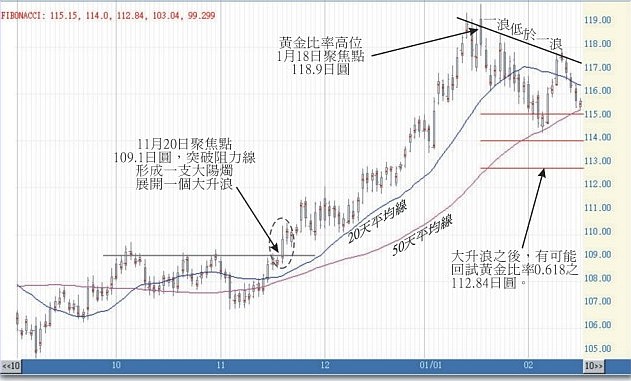 筆者認為,11月20日的109.1日圓是今次升浪的起步點,1月18日的118.9日圓是升浪的最高點,以此計算出來的黃金比率是0.382,為115.15日圓;0.5為114.0日圓;0.618為112.84日圓。以圖論圖,如這樣經歷八個月長期盤整才展開的大升浪,筆者認為,必須進一步調整到0.618的112.84方為合理。同時,2月16日雖回升到115.71價位收市,但如果未能突破上邊一浪低於一浪的下降趨勢線,便仍有可能繼續向下消化盤整。