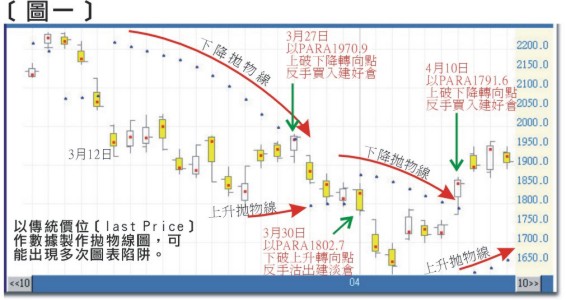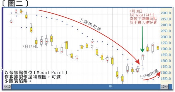 我們研製乾坤燭時,就把拋物線的改良也列入其中。聚焦點是每天成交最多的核心價位,我們用聚焦點的數據來計算拋物線的程式,得出的效果令人十分滿意。如投資者在3月12日沽出建淡倉,可放心持有,直至4月10日拋物線發出訊號(圖二),投資者才反手買入建好倉,這樣不但可減少犯錯,還可吃盡一個走勢。
