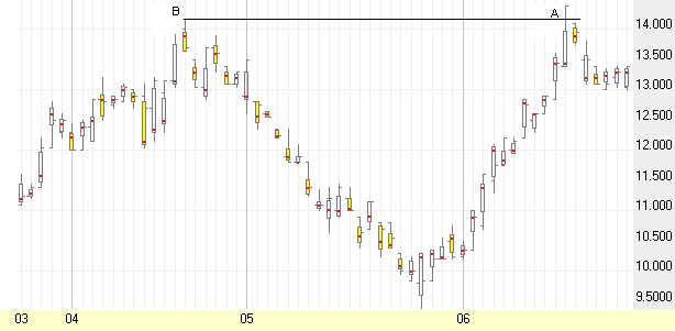 圖1是鷹君 (0041) 的陰陽燭圖,在A處,股價衝破之前20天高位(圖中B處)