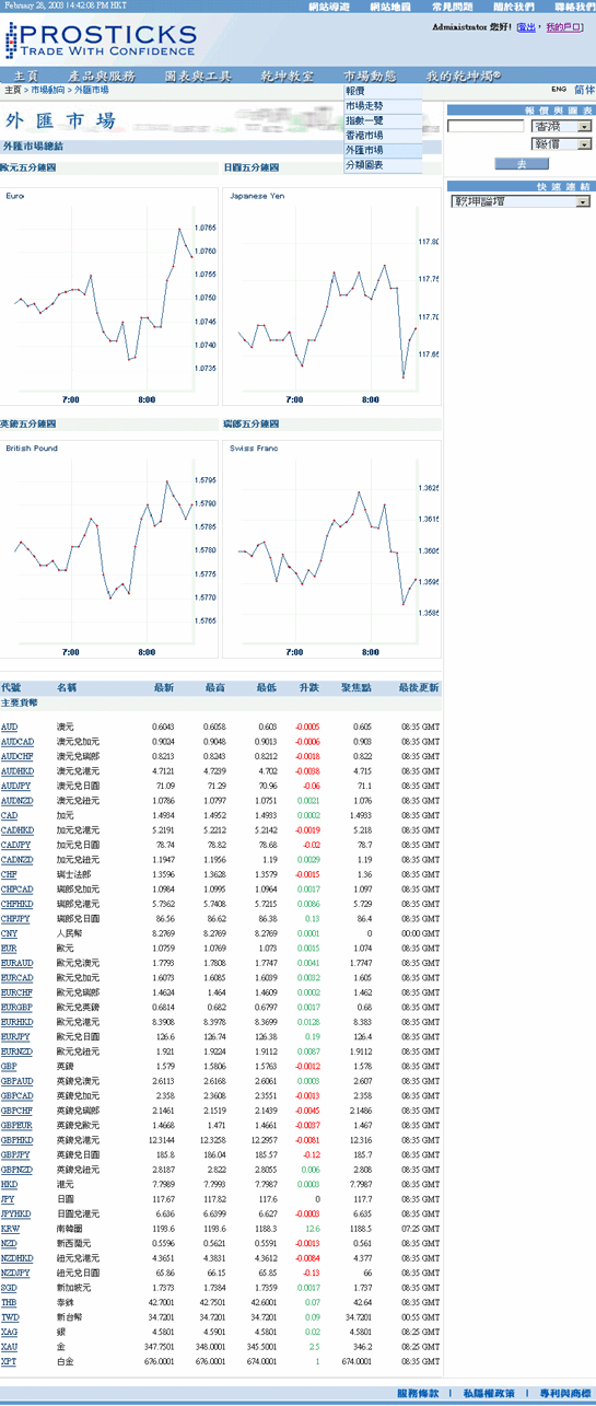 可收到最新外匯資訊,當中包括主要四大外幣 - 歐元、日元、英鎊及瑞士法郎的五分鐘走勢圖表及所有外匯的報價表(包括所有交叉盤報價)。
